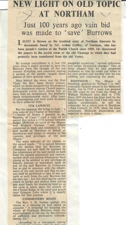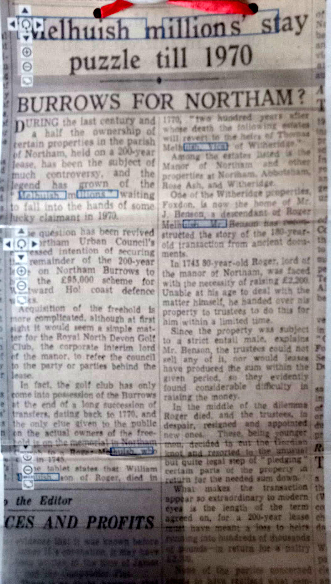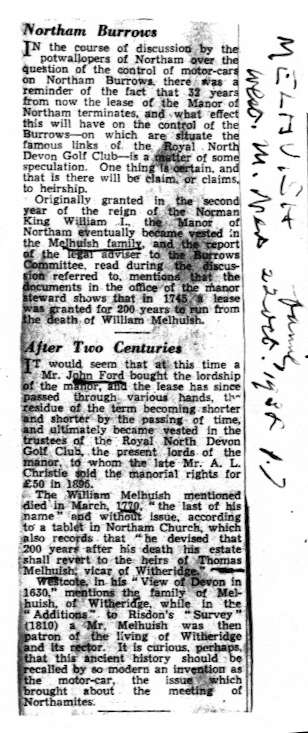 Inevitably the land had passed through many hands during the intervening two centuries and estates had been broken into smaller parcels and sold on. There had been a great deal of development including much of the town of Appledore and the seaside resort of Westward Ho! In 1895 the lordship of the manor had been acquired by the Royal North Devon Golf Club and their golf course occupied the Northam Burrows. If all of the leased estate was to be claimed by the heirs of Thomas Melhuish in 1970, a lot of people were going to worry about the impact on their properties. This was first highlighted at a meeting of the potwallopers of Northam as can be seen in the adjoining newspaper article from the Western Morning News dated 22 Oct 1938.
