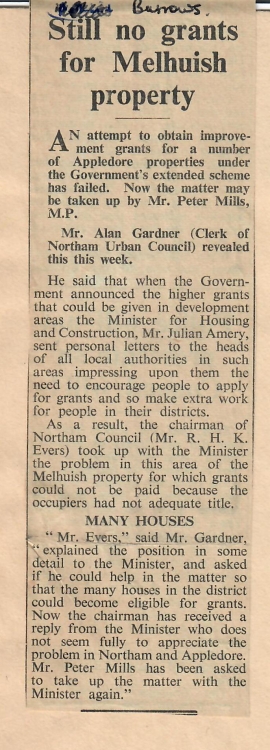 The story goes back to the mid-18th century when Roger Melhuish Esq owned Northam Manor and a great deal of land around Northam and Witheridge. In order to raise money, Roger disposed of Northam Manor and a great deal of other property on a lease to run for 200 years from the death of his son William. As his son died in 1770, the lease expired in 1970, and this is the "Appledore estate". The property included a great deal of the centre of the old town of Appledore. At that time the properties should have reverted to the heirs of his other son Thomas, vicar of Witheridge. There is a memorial tablet in Northam church commemorating the lease and giving some details.